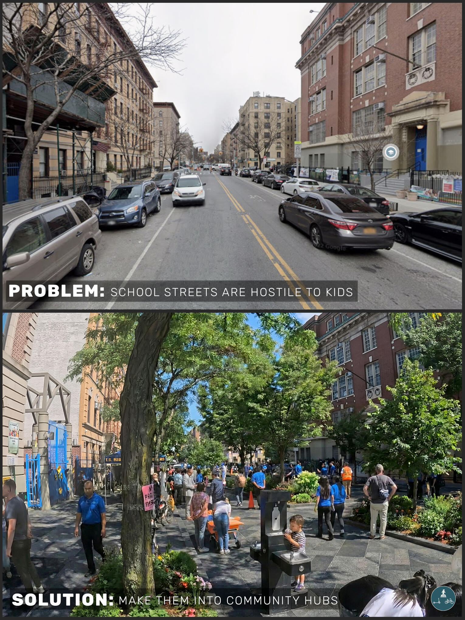 A quieter, safer, more welcoming environment for the city's kids that encourages families to walk or ride to school.